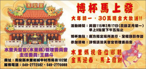 農曆年就要來臨,許多民眾總要往寺廟祈福請求馬年行大運馬到成功馬上有財,南投縣水里鄉天聖宮管委會主委王銀斗今年過年提供30萬現金大放送,2月17日正月初一上午9時至下午5時止,以博杯發財,王主委祝福大眾金馬迎春博杯發財、...