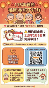 一年一度的農曆春節即將到來,為讓市民在農曆春節期間也能獲得穩定且持續的長照服務,於國曆115年2月14日(農曆12月27日)至國曆2月22日(農曆年初六)期間,長照1966專線採預約方式,若親友為身心障礙者、失智症者、評估期間符合健...