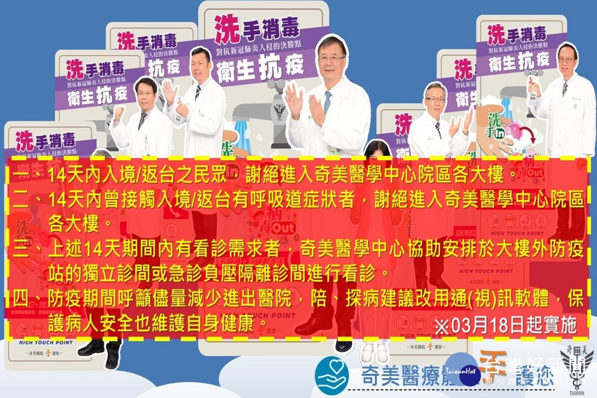 奇美醫學中心表示,為避免造成群防感染疑慮,3月18日起,14天內入境或返台民眾,禁止進入奇美醫學中心院區各大樓。14天內曾接觸入境或返台有呼吸道症狀者也禁止進入。14天期間內有看診需求者,該中心會協助安排於大樓外防疫站獨立診間或急診負壓隔離診間看診。