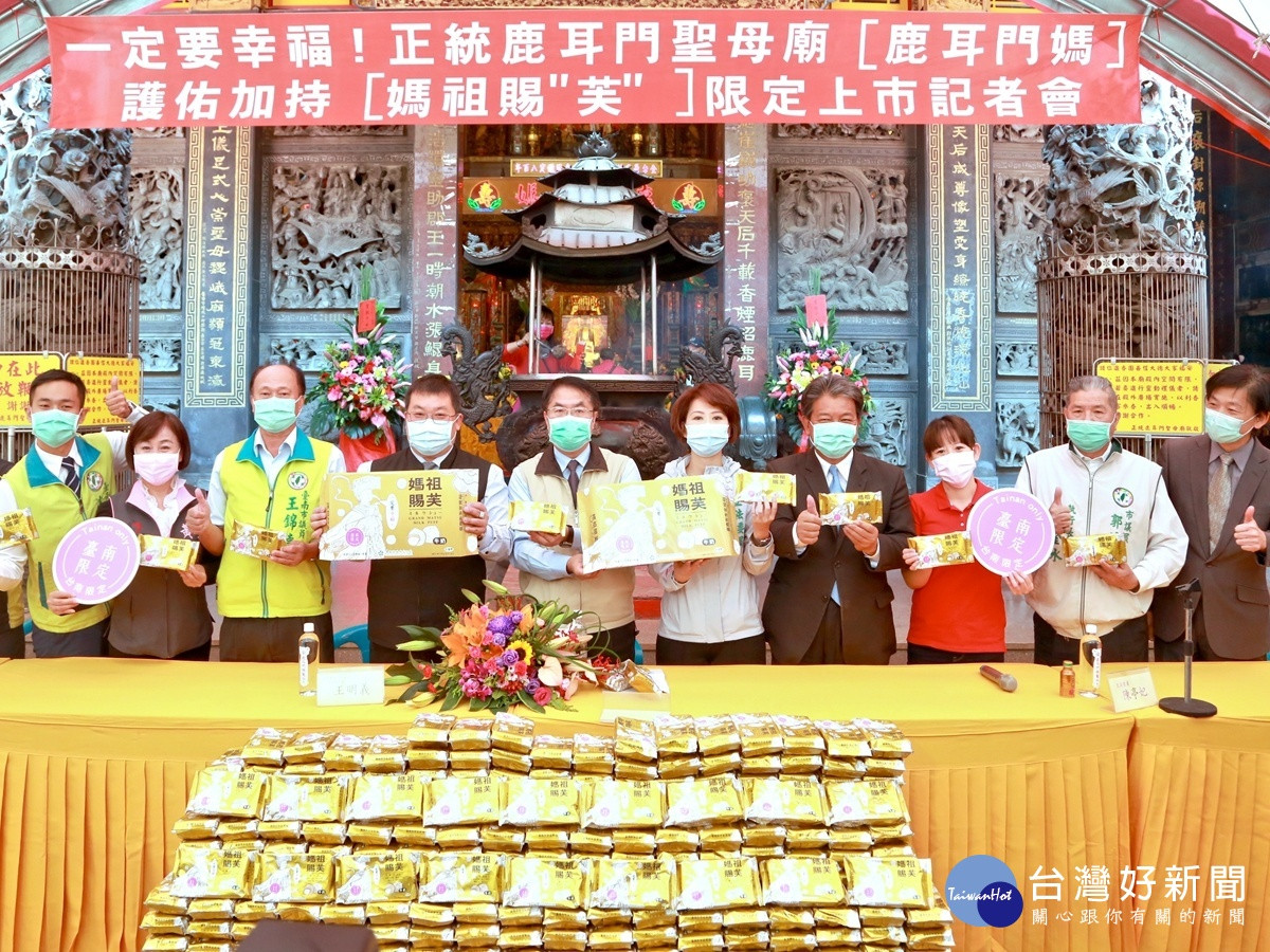 黃偉哲市長4/13與土城正統鹿耳門聖母廟主委王明義、文化局長葉澤山、安南區長葉誌明、立委陳亭妃、議長郭信良及市議員王錦德、黃麗招、李中岑、沈震東等各界貴賓共同上香祈福,為新產品過爐加持,向媽祖祈求護佑國泰民安。
