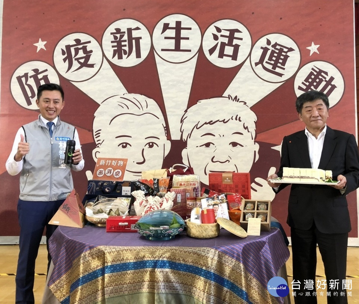 林智堅市長以「辦桌」概念,準備了滿滿一張大圓桌的各式新竹好物,有利利號、竹塹餅、新竹米粉、水蒸蛋糕、水潤餅、艷麗娘惹糕、福源花生、傻瓜肉粽等,要讓中央指揮中心同仁帶回家好好享用,還特地準備了〈市長帶你吃美食〉美食書,介紹新竹市的在地好滋味,更邀請部長防疫工作結束後一定要遊覽新竹的美景與美食;陳時中部長更對在地知名的水蒸蛋糕充滿興趣,直言看起來健康又可口。