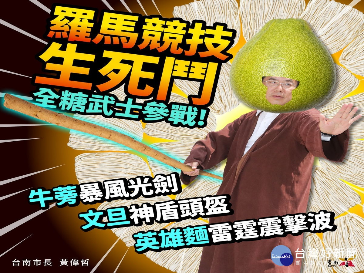 黃偉哲表示,感謝潘孟安縣長邀請決鬥,面對早先桃園鄭文燦市長的復興媽媽桃和潘孟安縣長的東港黑鮪魚,台南決定端出「牛蒡暴風光劍」、「文旦神盾頭盔」和「英雄麵雷霆震擊波」應戰。