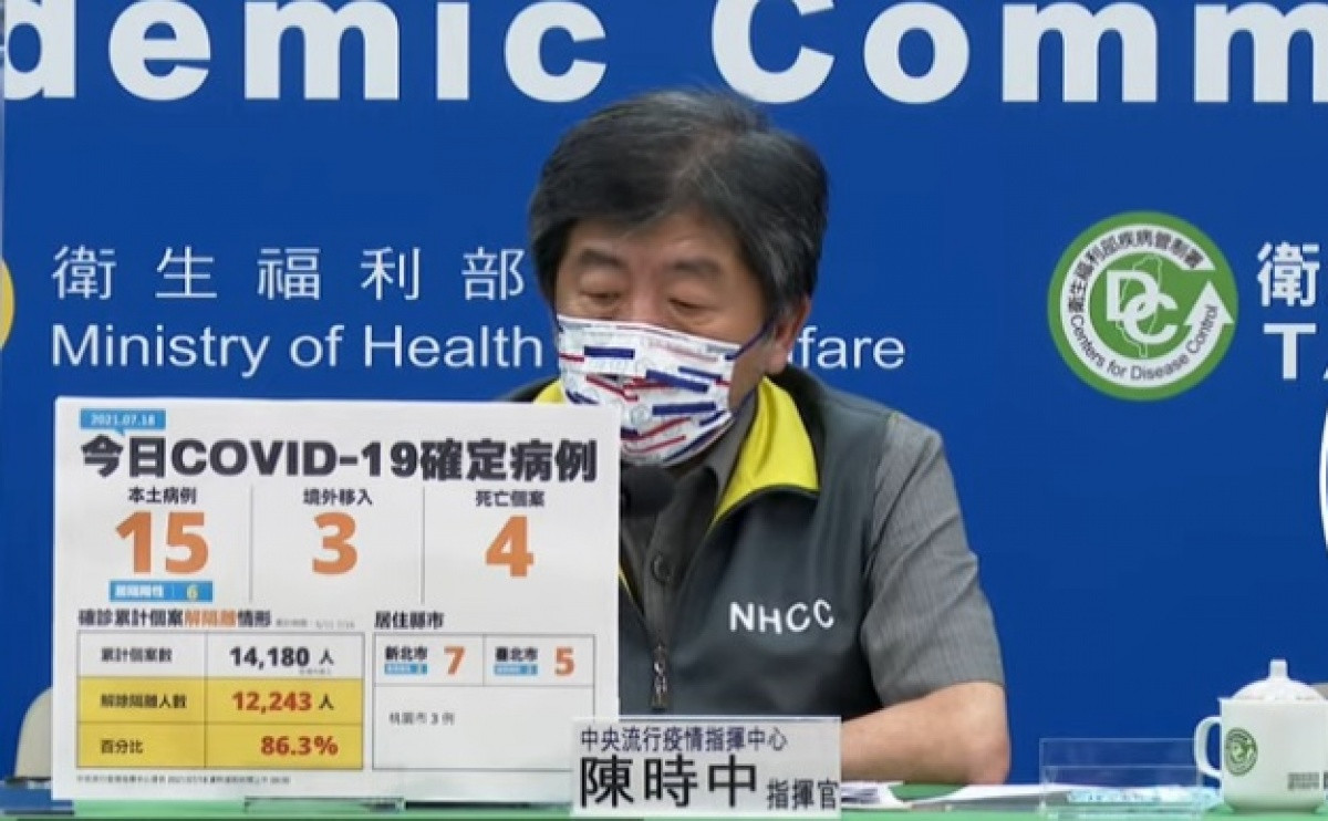 指揮中心表示,今日新增之15例本土病例(其中6例為居家隔離期間或期滿檢驗陽性者),為9例男性、6例女性,年齡介於20多歲至90多歲,發病日介於今(2021)年7月10日至7月17日。個案分布以新北市7例為最多,其次為臺北市5例、桃園市3例;其中9例為已知感染源,餘6例關聯不明,將持續進行疫情調查,以釐清感染源。