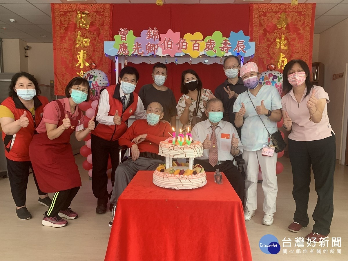 板橋榮家昨(5)日為曾錦及應光卿二位伯伯百歲壽辰,由於適逢父親節前夕,榮家特別在防疫的規定下,精心安排了簡單隆重又溫馨的祝壽活動,也邀請了曾伯伯的家屬齊聚於祥和樓一樓大廳,與家主任、工作同仁一同向兩位榮民長輩恭祝福如東海,日月昌明。