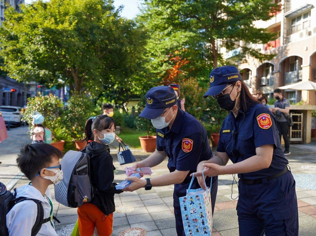 海山分局官警一早就出現在海山國小校門口,一同來為開學首日上課的小朋友加油打氣,員警在路口指揮著交通,小心引導著開心重返校園生活的學童,家防官也提醒學童平時應提高警覺,不隨便與陌生人來往、不收取來路不明的食物跟禮物,教導孩童如何避免不法危害及處置應變。