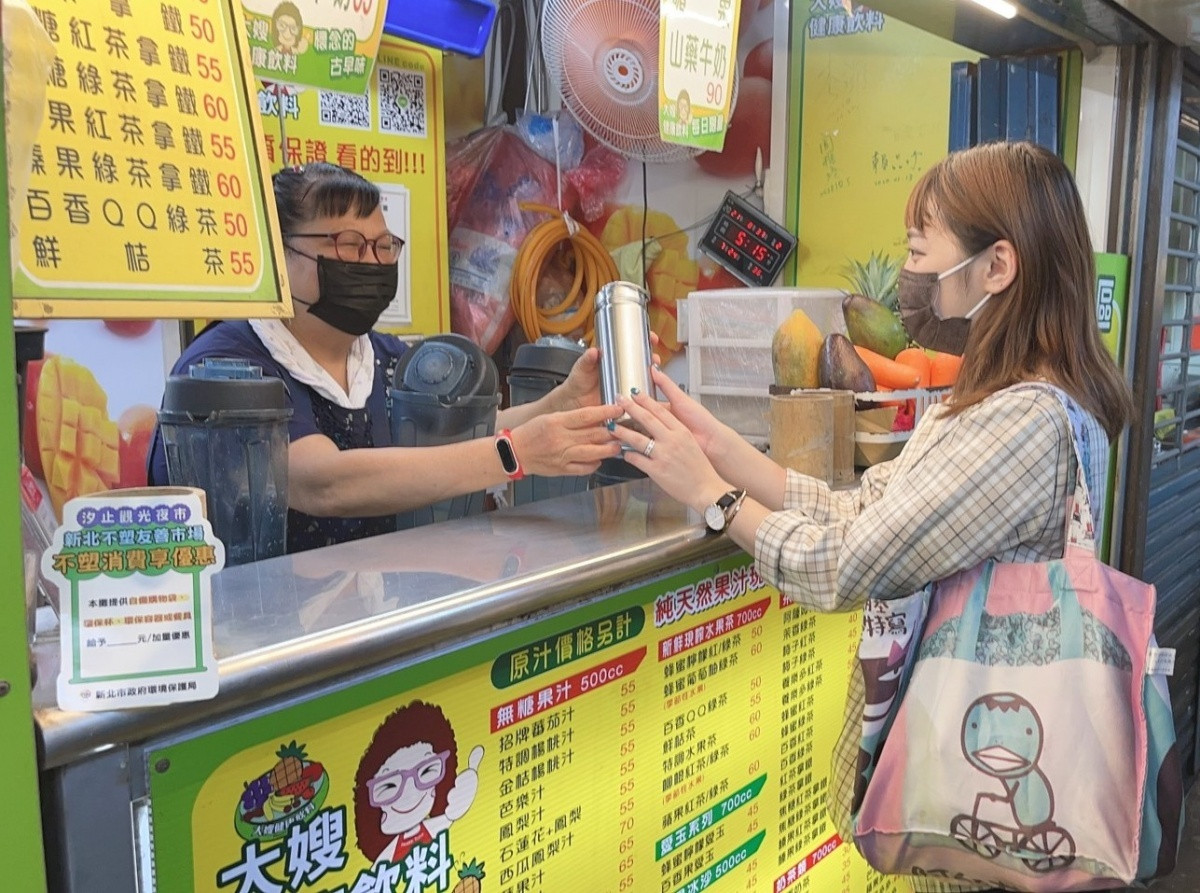 此外,各攤商也加入減塑行列,民眾只要自備購物袋、環保杯、環保容器或餐具消費,即享有折價優惠或加量福利,像是秀豐市場莠莠蔬果,提供自備購物袋給予折價或加量優惠;秀豐市場海鮮人家及明珠海鮮,提供購物袋給予5元折價優惠;汐止觀光夜市大嫂健康飲料店,提供使用環保杯給予加量福利,另外汐止觀光夜市亂亂切攤商也提供民眾自備環保容器給予送小菜福利。