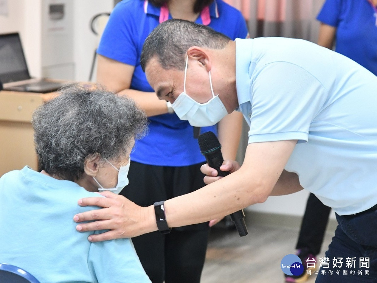 新北市長侯友宜2日前往位於新莊中正路上社團法人中華培愛全人關懷協會銀髮俱樂部,關心長輩及防疫措施,96歲的楊賴省阿嬤對於重啟銀髮俱樂部,可以參加活動課程,活絡筋骨、見見老朋友,相當開心!侯友宜與長輩一起做防疫健康操,不時出現同手同腳,惹得現場阿公阿嬤哈哈大笑。