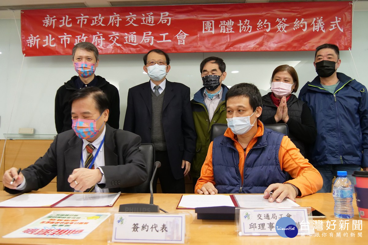 勞動部關係司長王厚偉、新北市勞工局長陳瑞嘉及新北產業總工會理事長洪清福等出席見證簽約儀式;交通局強調,基於互信互諒的基礎上,將持續協調溝通、相互理解建立共識,以發展穩定和諧的勞資關係,順利推動交通市政工作。