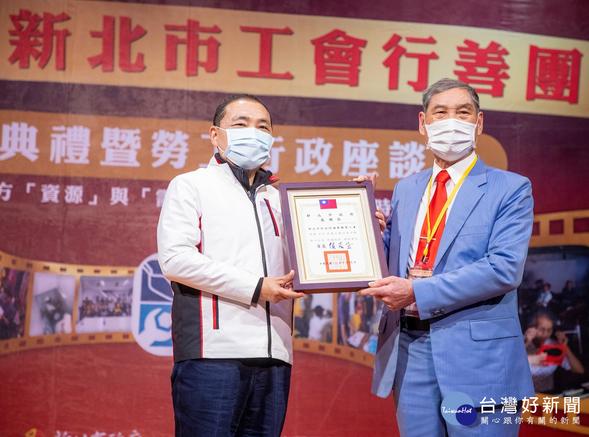 新北工會行善團長年投入公益活動,新北市政府今(24)日舉辦「111年新北市工會行善團頒獎典禮」,市長侯友宜親自頒獎表揚75家工會,感謝他們幫助弱勢族群,溫暖社會每個角落。勞工局表示,新北有143家工會參與行善活動,總計服務1,030場次、出動志工6,250人次、受益總數72,961人、捐助物資總值達2,500萬元(含居家修繕家戶數198戶、受益人數1,317人)。