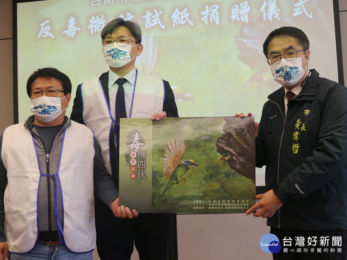 近年來新興合成毒品種類及包裝推陳出新,吸毒年齡層年輕化,社團法人台南市噶瑪噶居戒癮協進會長期熱衷反毒工作,2/24上午致贈「反毒微跡試紙」2千份給台南市政府,由臺南市黃偉哲市長代表受贈。