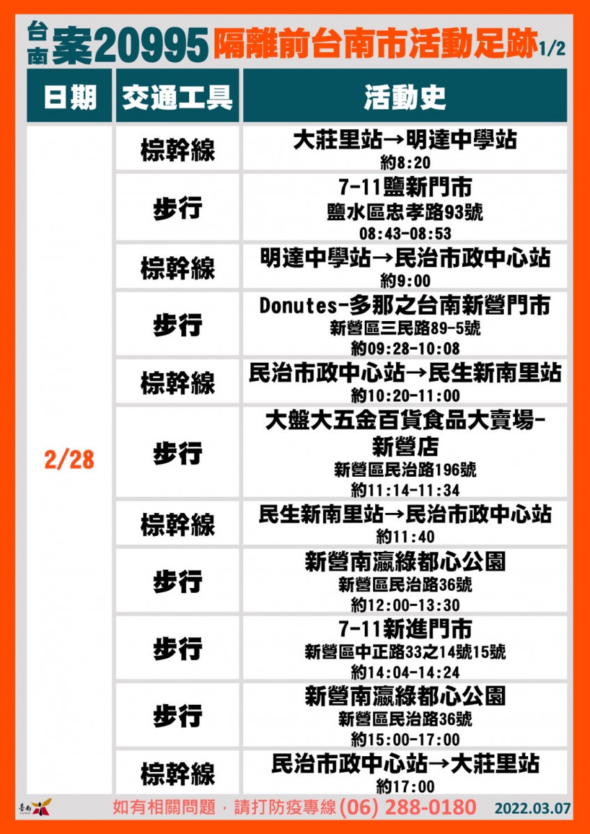 衛生局指出,案20995平日搭乘棕幹線公車上下學,居家隔離前於活動範圍包含7-11鹽新門市及歡雅門市、Donutes-多那之台南新營門市、大盤大五金百貨食品大賣場新營店、新營南瀛綠都心公園等地,匡列66位相關接觸者;案20996於南市活動範圍包含洪昌麻辣鴛鴦火鍋、寶雅新營民治店,並曾於3月4日搭乘台鐵及藍幹線公車,匡列76位相關接觸者。