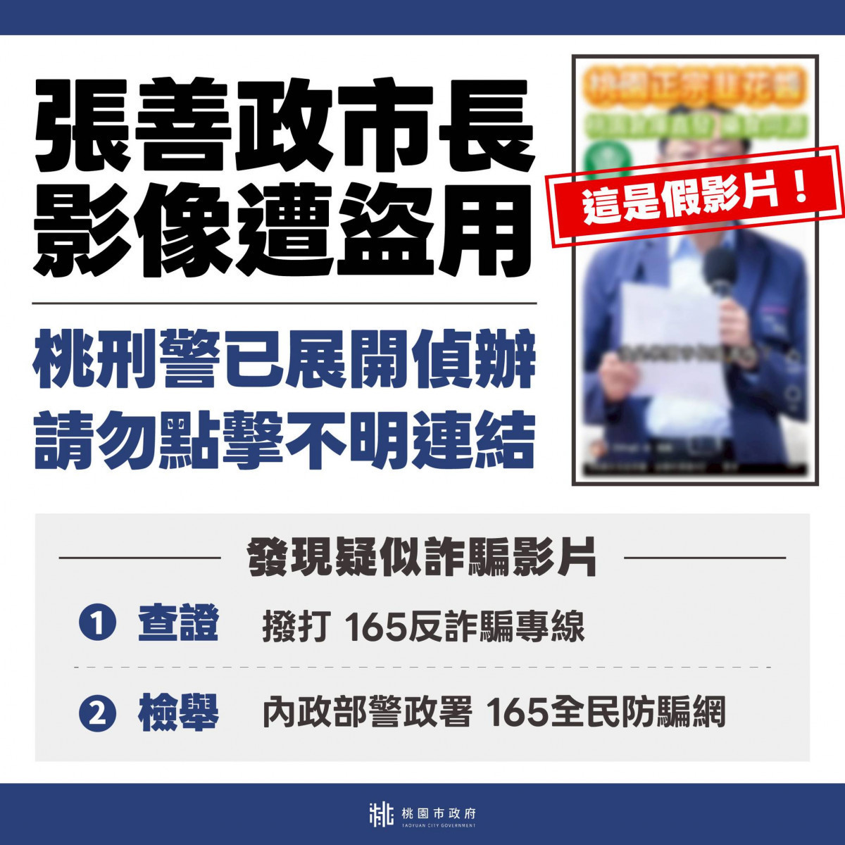 桃園市政府28日表示,臉書(Facebook)流傳一則「張善政市長推薦韭菜醬」的影片,是詐騙集團利用AI技術合成製作,內容完全不實。對此,桃園市政府警察局刑事警察大隊已展開調查,除向臉書平台...