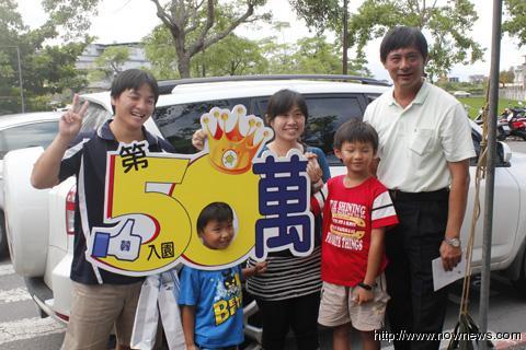 2013宜蘭國際童玩藝術節日前產生第50萬名遊客!林哲瑋帶著妻子和兩個兒子才進入冬山河親水公園大門,就被工作人員告知幸運中獎了,一家四口感到十分意外與開心。縣政府秘書長陳鑫益連忙代表主辦單位送上總值約5萬元的賀禮,包括1本終身免費樂遊童玩節的護照。