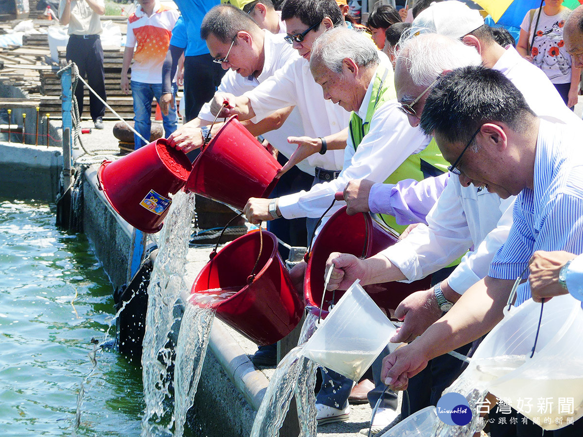 六輕副總陳文仰率領大家放流57.315萬尾5公分以上高價值魚苗。(記者林辰芬拍攝)