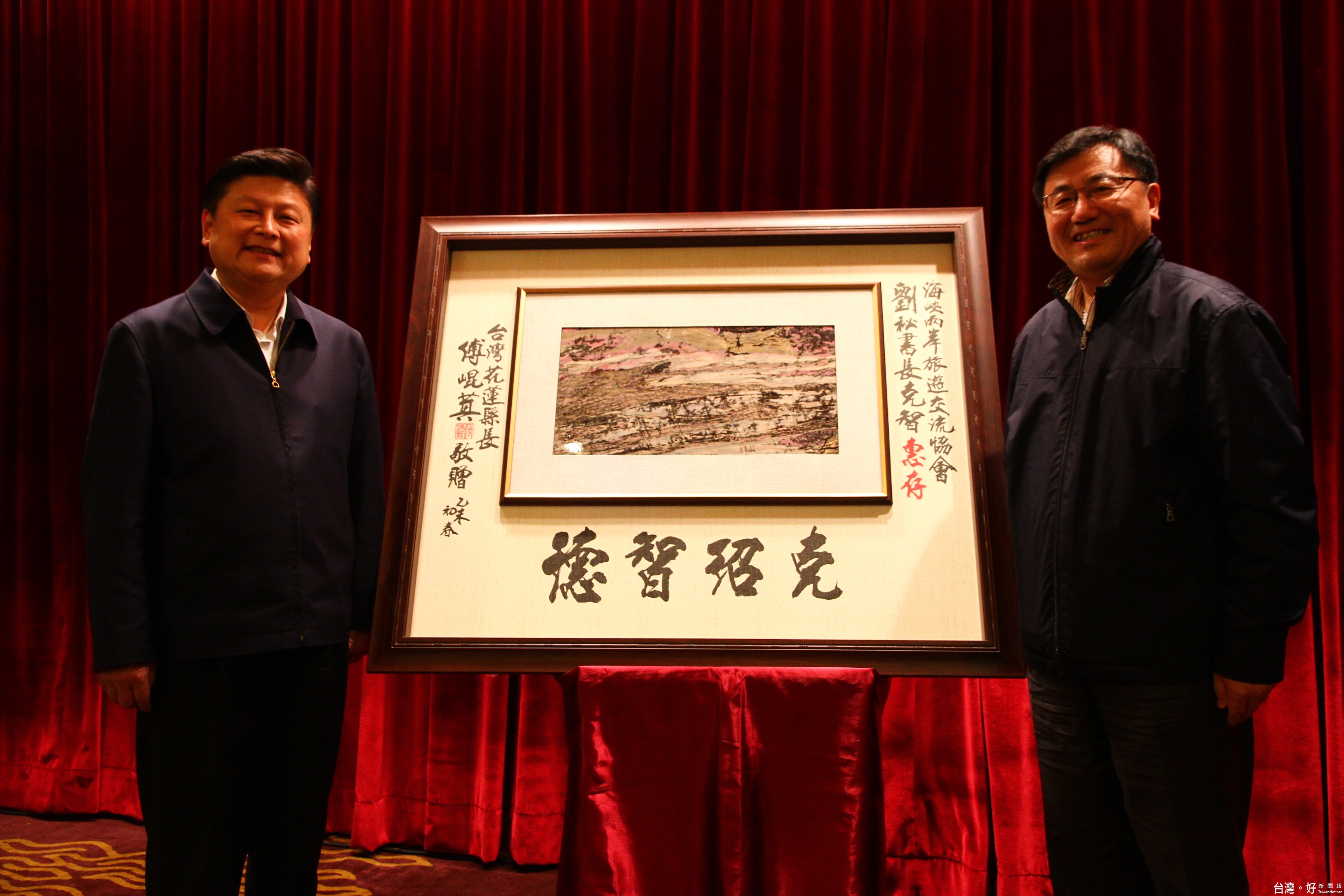 會中,傅縣長致贈刻有「克紹智德」的玫瑰石版畫予劉克智秘書長,並贈送茶米禮盒予每位來訪貴賓;劉秘書長則回贈雲南名產普洱茶等禮品,場面熱絡。