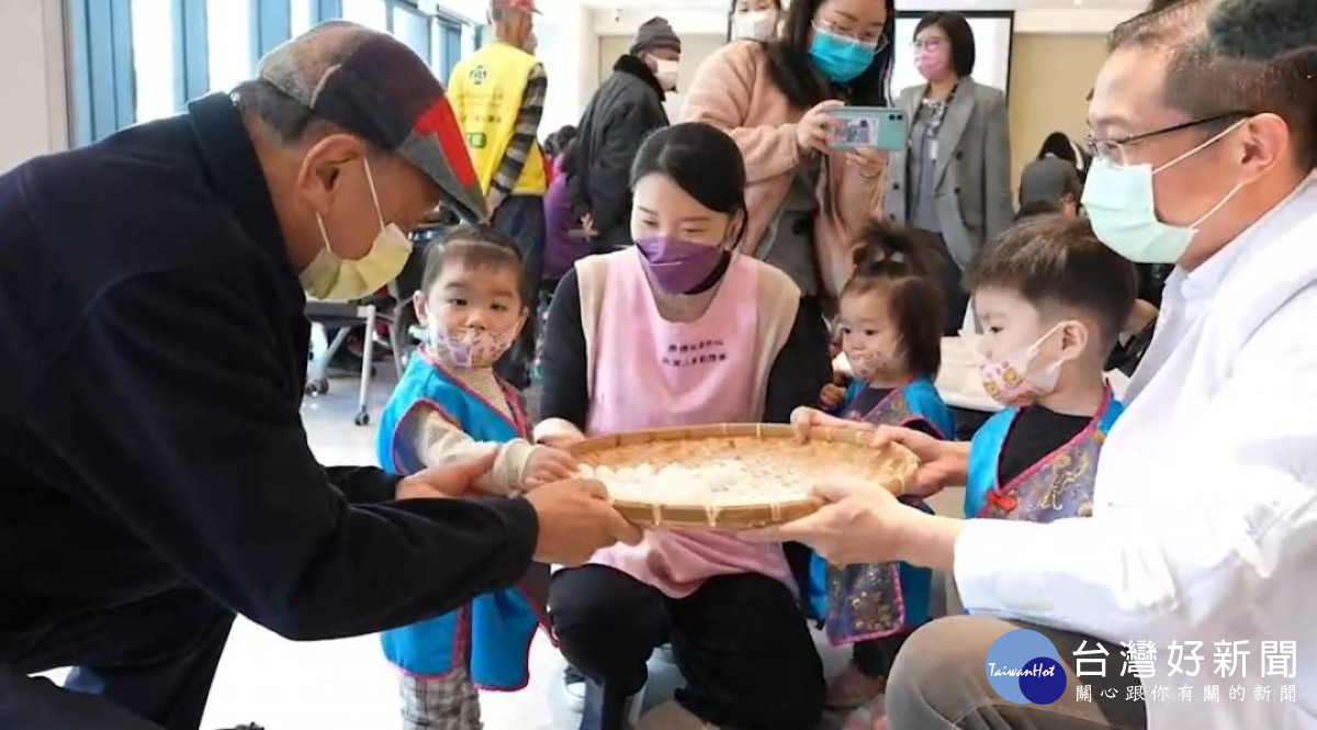 秀傳總裁黃明和與托嬰中心的小朋友一起搖元宵。圖/記者鄧富珍攝