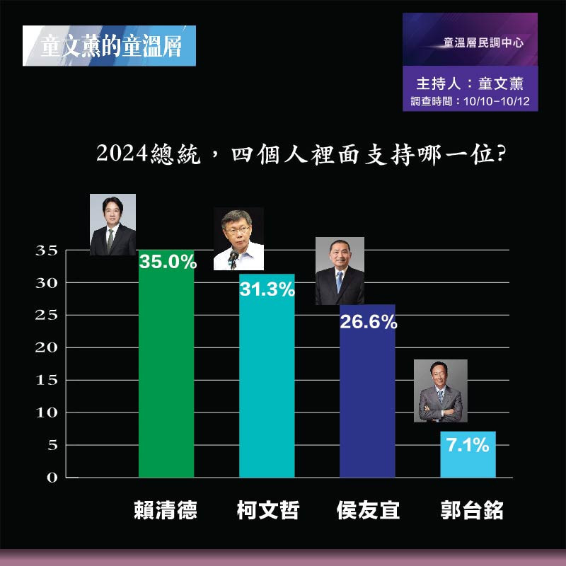 「童溫層AI民調中心」指出,以內政部戶政司人口資料為母體,對樣本的縣市、性別、年齡進行多重反覆加權(Raking),以使樣本和母體結構一致後,大多數受訪者表示會去投票(67.1%),且認為最有能力當總統的依序為賴清德(36.3%)、柯文哲(31.2 %)、侯友宜(21.6%)、郭台銘(10.9%)。而受訪者最支持的候選人為賴清德(35.0%),接著為柯文哲(31.3%)、侯友宜(26.6%),而郭台銘則為7.1%。