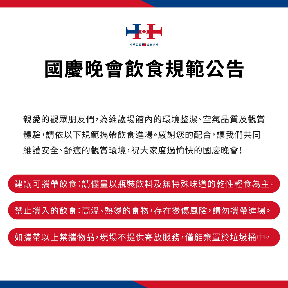 北市府觀傳局說明,國慶晚會將於10月5日下午16時開放入場,並於下午18時正式開始,與全國民眾一同為中華民國慶生。觀傳局指出,所有入場觀眾需持票券、憑票對號入座,並請攜帶身分證件,票券遺失者無法補發且不得進場。另為維護現場秩序,場館內禁止攜帶長柄雨傘(建議攜帶淺色透明雨衣或折疊雨傘以因應天氣變化)、大型包包及各類危險物品。