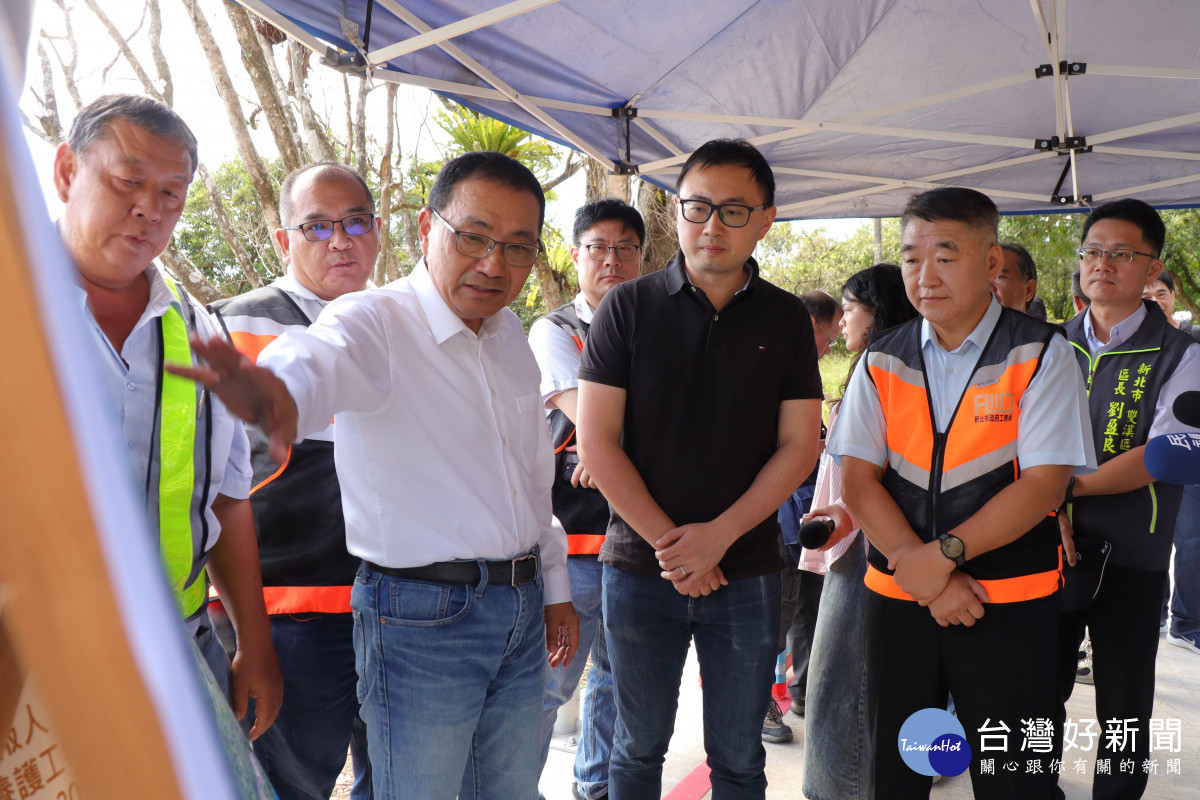 侯友宜表示,去年10月山陀兒颱風帶來豪大雨,導致雙溪區區道北38線4K+500~6K+000區間邊坡道路土石坍落,崩塌範圍長180公尺、高200公尺,不僅中斷道路,更危及道路下方住戶安全。在地質與天候條件不佳的情況下,市府施工團隊仍於今年6月完成第一階段的復建工程,特別肯定團隊的努力,讓地方居民與用路人能重獲安全順暢的通行環境。