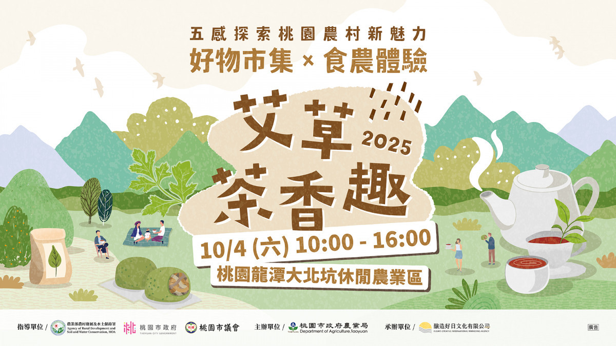 中秋連假即將登場,桃園市政府農業局邀您走進龍潭淺山客庄,感受茶香與艾草香交織的療癒氛圍,「艾草茶香趣」農村社區產業成果活動將於10月4日上午10點至下午4點在大北坑休閒農業區熱鬧登場。活動結合茶體驗、艾草手作、風土市集、藝文表演,以及首次亮相最新農村好物,邀請民眾一起漫遊感受桃園農村遊趣。