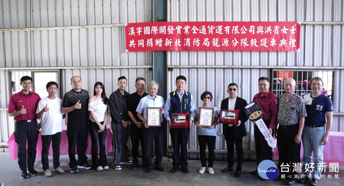 為發揚大愛無私奉獻精神,提升新北市緊急救護品質,漢宇國際開發實業公司、全通貨運公司與洪省女士等,今(3)日共同捐贈新北市政府消防局第三救災救護大隊龍源分隊高頂救護車1輛。內部配備救護器材含履帶式搬運椅、CPR大人電極貼片、快速應變救護背包、戰術防護背包及出血控制戰傷包,除即時提供救護人員一臂之力,更強化救護人員外傷處置及緊急救援能力。
