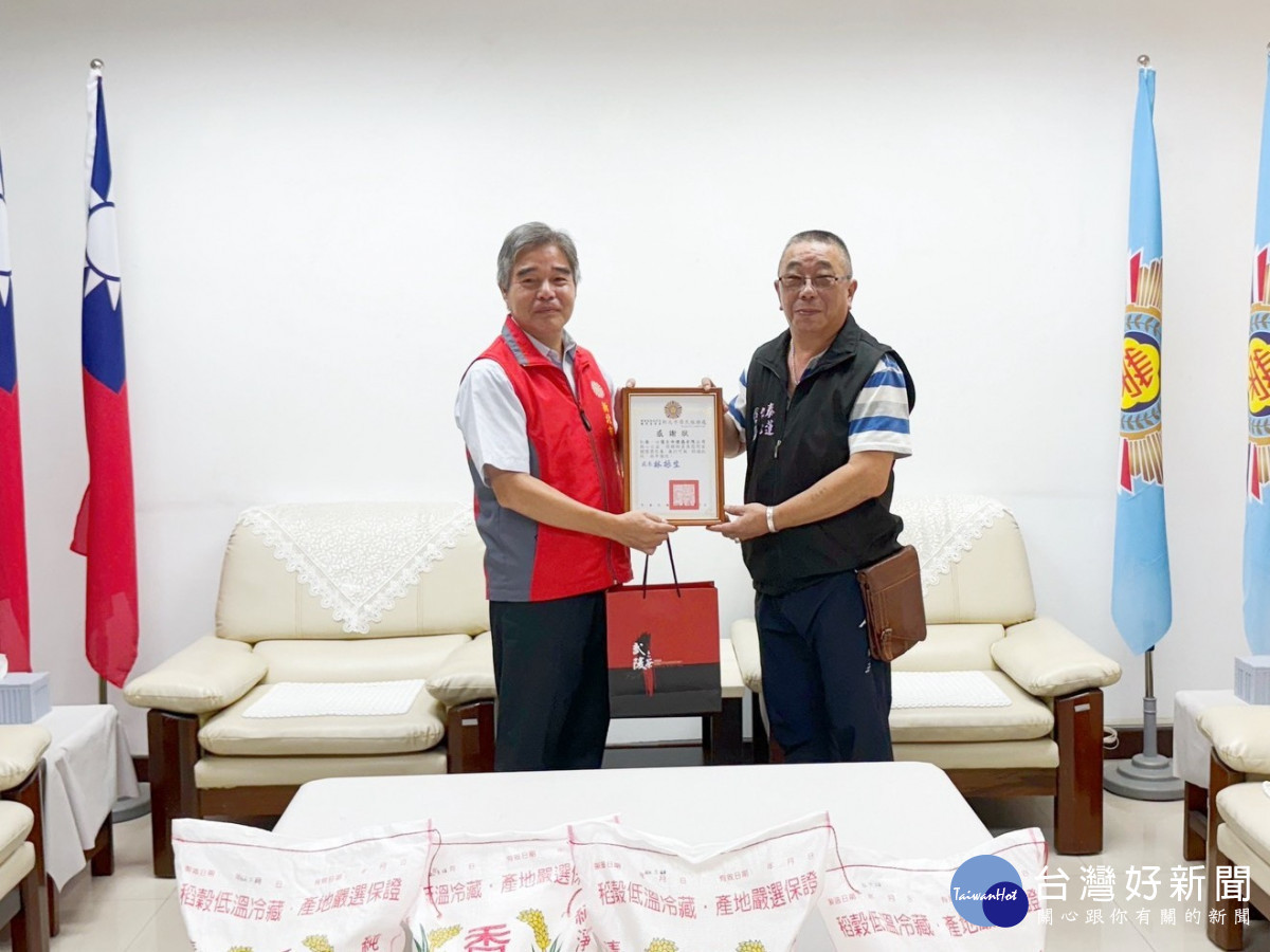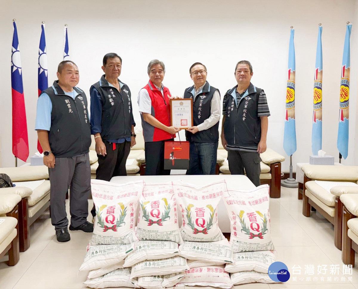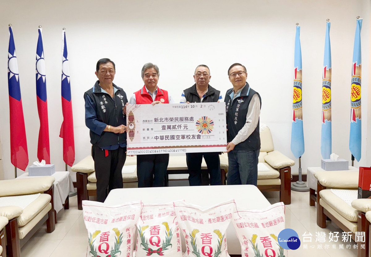 中華民國空軍校友會長期關懷、協助照顧亟需幫助的退伍軍人袍澤,主動鏈結社會善心企業,募集白米300斤及愛心善款新臺幣1萬2仟元,於秋節前夕委請新北市榮民服務處轉發、運用,共同服務照顧榮民、榮眷。該會理事長昨(2)日率重要幹部,偕同愛心捐贈企業仁泰、心蓮生命禮儀有限公司經理等至榮服處捐贈物資,林振生處長代表受贈,並回贈感謝狀,感謝退伍軍人社團及企業界的善行義舉。