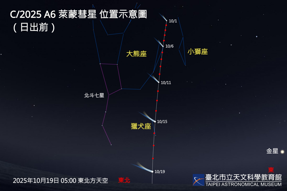 十月星空堪稱一場熱鬧的天象接力,從彗星到流星雨、行星合與月掩亮星,多樣而精彩,都是肉眼或簡易的雙筒望遠鏡即可欣賞的天象,千萬別錯過!台北天文館表示,今年初才被發現的C/2025 A6「萊蒙彗星」近期快速增亮,10月初可望達到約4等,至10月21日(二)通過近地點時更可升高到3等,成為少見的肉眼彗星。建議10月上旬可於日出前朝東北方嘗試搜尋;中旬後則於日落後朝西北西方向觀察,透過雙筒望遠鏡可更容易辨識出其棉絮般獨特的身影。