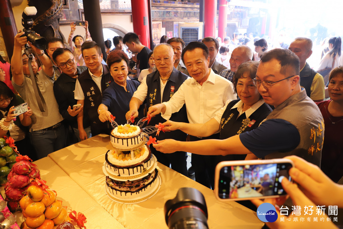 嘉義縣新港奉天宮今天(6日)舉辦「開台媽祖契子女中秋回宮團圓祈福典禮」,全國各地契子女與信眾齊聚一堂團圓參拜,嘉義縣長翁章梁、新港鄉長葉孟龍及奉天宮董事長何達煌等人一同切蛋糕慶祝中秋佳節、慶團圓。