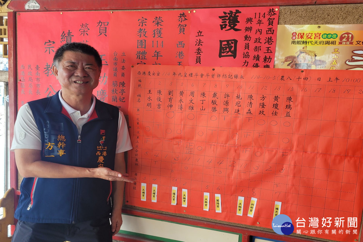 西港慶安宮有台灣第一香科廟宇之稱,方一峰總幹事表示,舉辦九皇禮斗祈安植福法會,祈求賜福消災、延年益壽、風調雨順、國泰民安、工商興旺、五穀豐收。九皇禮斗法會俗稱禮斗或拜斗,是道教界最高法會之一。法會期間,請得道大法師連續禮懺9天,為參與禮斗民眾祈安植福。九皇禮斗法會已舉辦40多年了,禮斗數持續增加至1275份,受限廟內空間,去年就有100餘人無法參與。