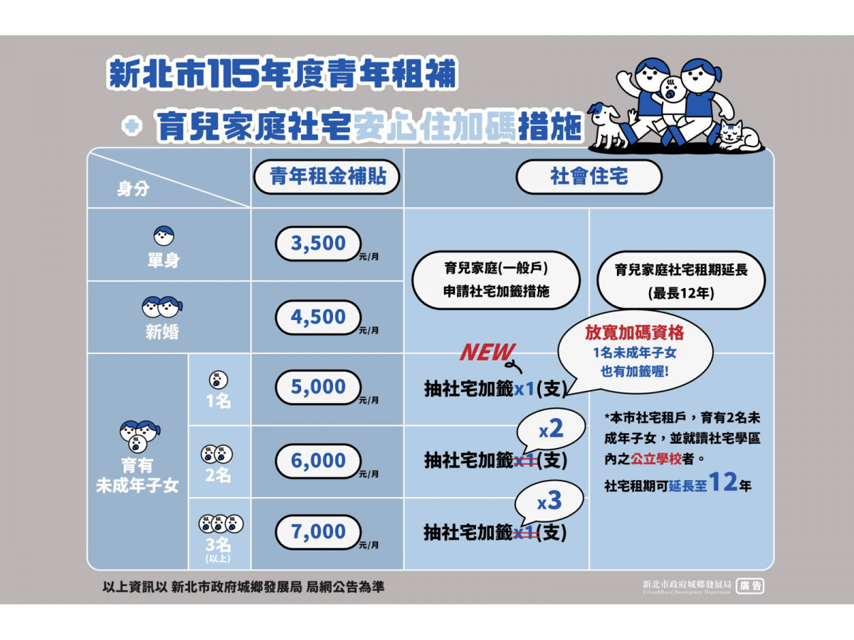 除社宅政策外,新北市政府延續青年租金補貼政策,減輕青年居住負擔,經審查符合資格者可享有單身3,500元、新婚4,500元、育(孕)有未成年子女(胎兒) 1人5,000元、2人6,000元、3人以上7,000元的租金補貼,持續給予育兒家庭支持與協助,打造宜居新北。
