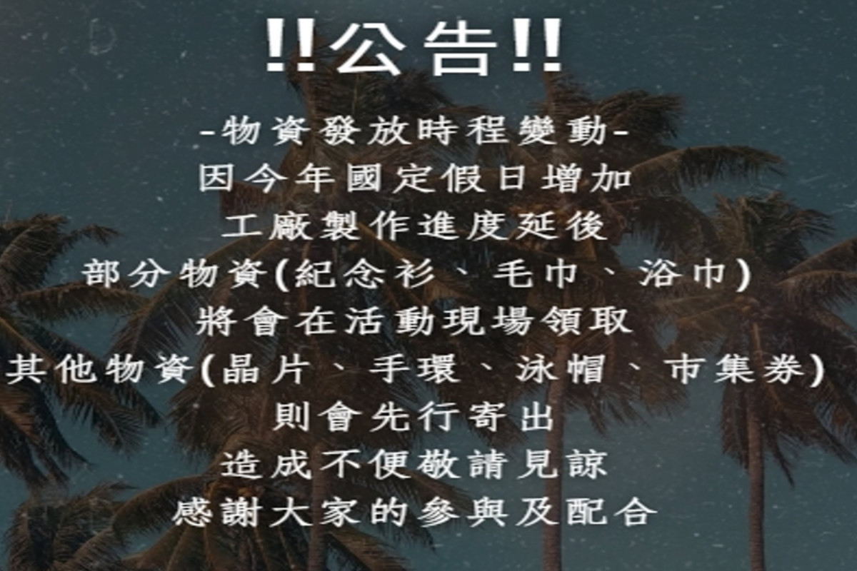 將於11月2日舉辦的泳渡虎頭埤活動,原訂9月底前寄送參賽好禮泳帽、紀念衫、活動手環、100元折價卷等給各組領隊,再由領隊協助發放給小組成員。受10月連假影響,預定的工廠時程變動,部份參賽好禮來不及發放。主辦單位表示,毛巾、浴巾、紀念衫等會在活動現場發放,手環、晶片、泳帽、市集券等則會先行寄出,造成不便,敬請見諒。