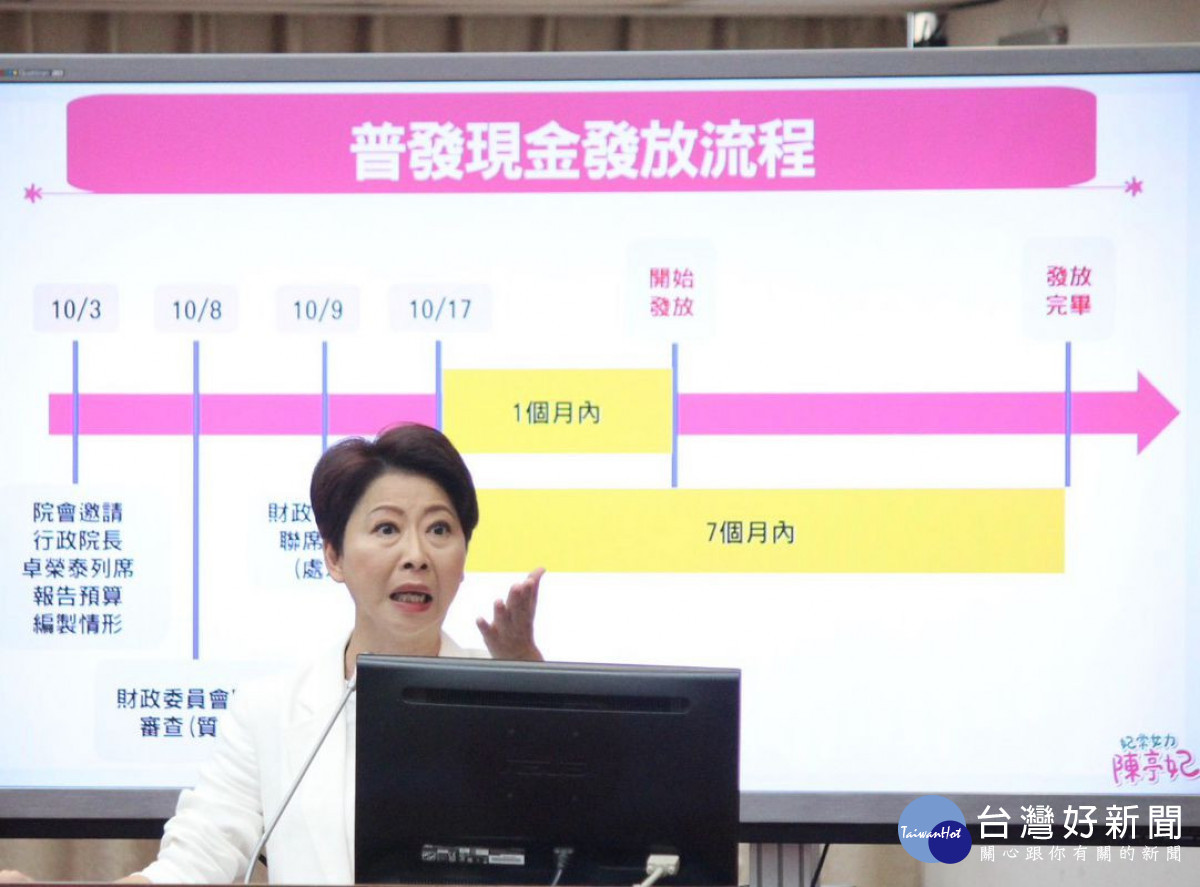 陳亭妃提醒,三讀完成至總統府公告的期間,中央可以先行啟動行政程序,待總統府公告後就能立即執行,尤其依照過往經驗,有425萬人民是申請直接入帳,務必要讓民眾在最快時間內收到現金,政府既然已公布總統公告後一個月內發放,就要確定能說到做到。