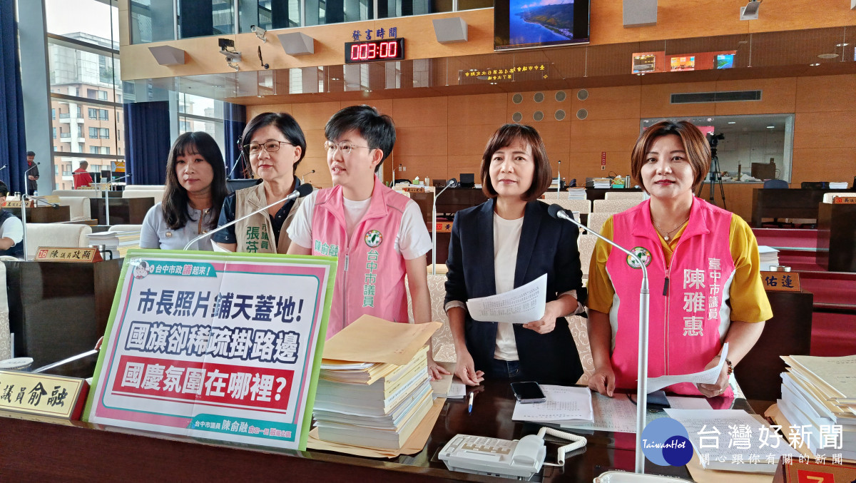 今年中華民國國慶晚會9日在台中市舉行,不過,民進黨市議員陳俞融、張芬郁、陳雅惠、陳淑華、謝家宜質疑台中市主要幹道國旗懸掛稀疏,沒有國慶氣氛,在台中市議會提臨時動議,要求市府立即檢討改善。不過,市府建設局強調,「旗海之城」在台中,台中市政府懸掛1.6萬面國旗,近三年數量均創歷年新高。