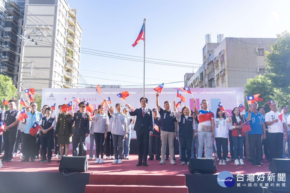 慶祝中華民國114年國慶,新竹市政府10日上午7時於金城一路「將軍村」舉辦「舞耀國慶、竹韻齊揚」國慶升旗典禮,現場湧入超過1,500名市民朋友熱情參與。代理市長邱臣遠率領市府團隊偕同來賓齊聚一堂,在國旗下共同慶祝中華民國生日的光榮時刻。