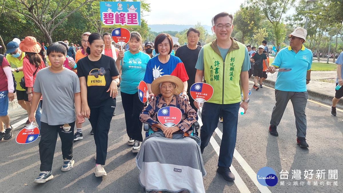 活動第二天是10月10日國慶日,升旗典禮儀式帶著大家邁向新的一天,而後是在暖身運動後的八堡圳健行,參與健走的民眾乘著晨光步履輕鬆的漫遊八堡圳美景。今日參與人群中有剛滿週的小寶貝由父毋推著嬰兒車來參加,也有高齡百歲人瑞一同為中華民國國慶祝賀。