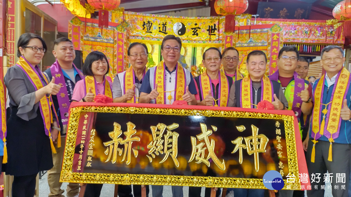 新北市副市長劉和然今(11)日前往永和「秀朗聖安宮」參拜祈福,恭祝保安廣澤尊王聖誕千秋、香火鼎盛,並祈求新北市政順利推行、市民安居樂業。為感謝廟方長年投入公益與地方服務,劉副市長特別代表市長侯友宜贈匾「神威顯赫」,以表達敬意與感謝之意!