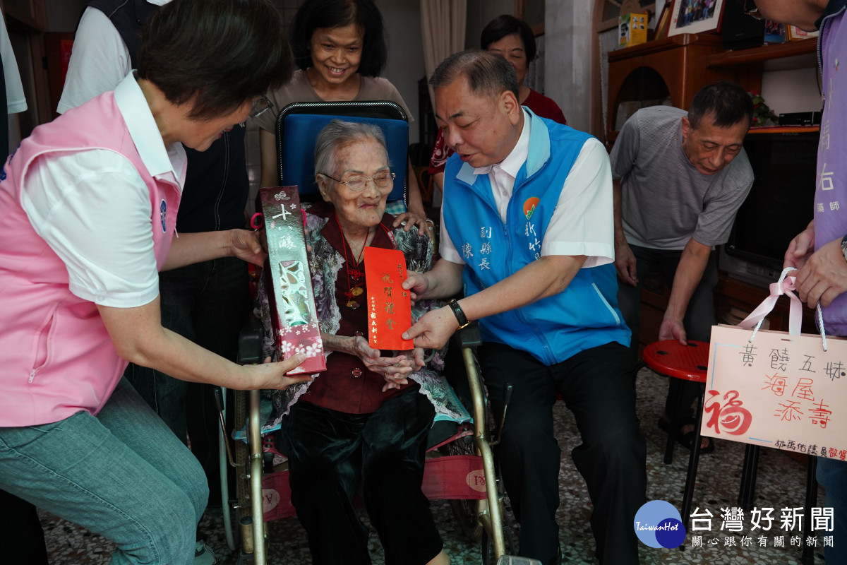 同樣是百歲的林江是今日拜訪7位人瑞之中,唯一的男性。林江看到眾人來拜訪,連忙起身招呼大家,他台語流暢,雖然行動緩慢,但家屬說,他不僅能從一樓爬到二樓,頭腦靈敏,記憶力還很好,令眾人稱羨。