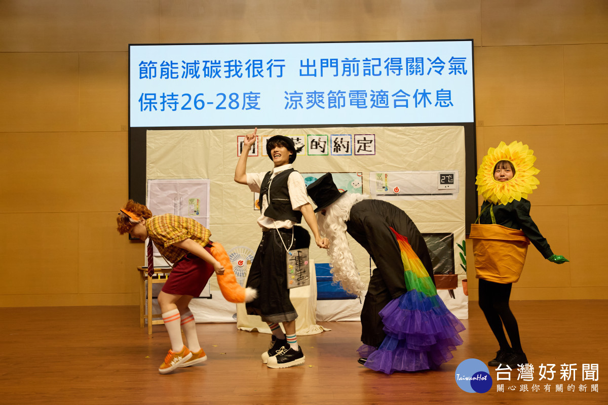 台電指出,節電舞台劇「向日葵的約定」,透過貓咪兄妹與向日葵等角色的用電日常,帶出冷氣、冰箱等家電的良好用電習慣。劇中琅琅上口的節電歌曲,也讓學童開心哼唱「出門記得關冷氣」、「冰箱不要放太滿」等節電妙招,現場互動熱烈,歡笑不斷。