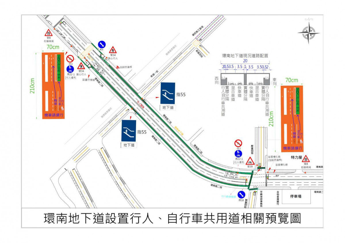 交通組組長王瑞程表示,環南路地下道第三階段工程將於10月15日上午5時完成最後施工作業並開放通行。本次完工後,道路通行方式將調整為:原機車道變更為「行人、慢車專用道」;原汽車道改為「汽、機車混合車道」,其中內側車道為「大型車及汽車專用車道(禁止機車行駛)」,外側車道則為「汽、機車共用車道」。維持雙向雙線通車。