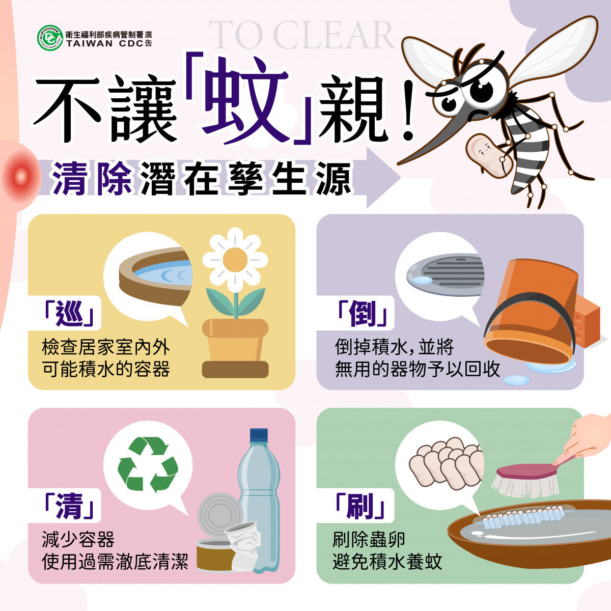 疾管署提醒,近期氣溫仍適合蚊子活動及生長,請民眾落實「巡、倒、清、刷」,主動清除家戶內外孳生源,以降低病媒蚊密度;戶外活動時請穿著淺色長袖衣褲,使用政府機關核可的防蚊藥劑敵避(DEET)、派卡瑞丁(Picaridin)或伊默克(IR-3535)等有效成分之防蚊藥劑。若出現發燒、頭痛、後眼窩痛、肌肉關節痛、出疹等登革熱疑似症狀,應儘速就醫,並告知旅遊活動史。也請醫療院所提高警覺,加強詢問就診者之TOCC(旅遊史、職業史、接觸史、群聚史),並可使用登革熱NS1快篩試劑輔助診斷及早通報,以利衛生單位即早採取防治工作。有關登革熱相關資訊可至疾管署全球資訊網(https://www.cdc.gov.tw/)查閱,或撥打免付費防疫專線1922(0800-001922)洽詢。