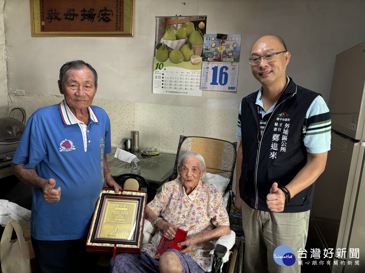 九九重陽敬老傳情,重陽節未到、敬老金及禮物先行,外埔區長葉聯慶公出,特派主任秘書鄭進來代表市盧秀燕及區長葉聯慶,由里長陪同,於十六日上午分別訪視馬鳴里一百零三歲人瑞劉雪卿女士及水美里滿百人瑞李蘇芽在女士,贈送總統府及臺中政府禮金、禮品,並祝福阿嬤們康健。鄭主秘一行與人瑞、家人話家常中,祝福阿嬤們吃得長長久久,每年都能來問候阿嬤。