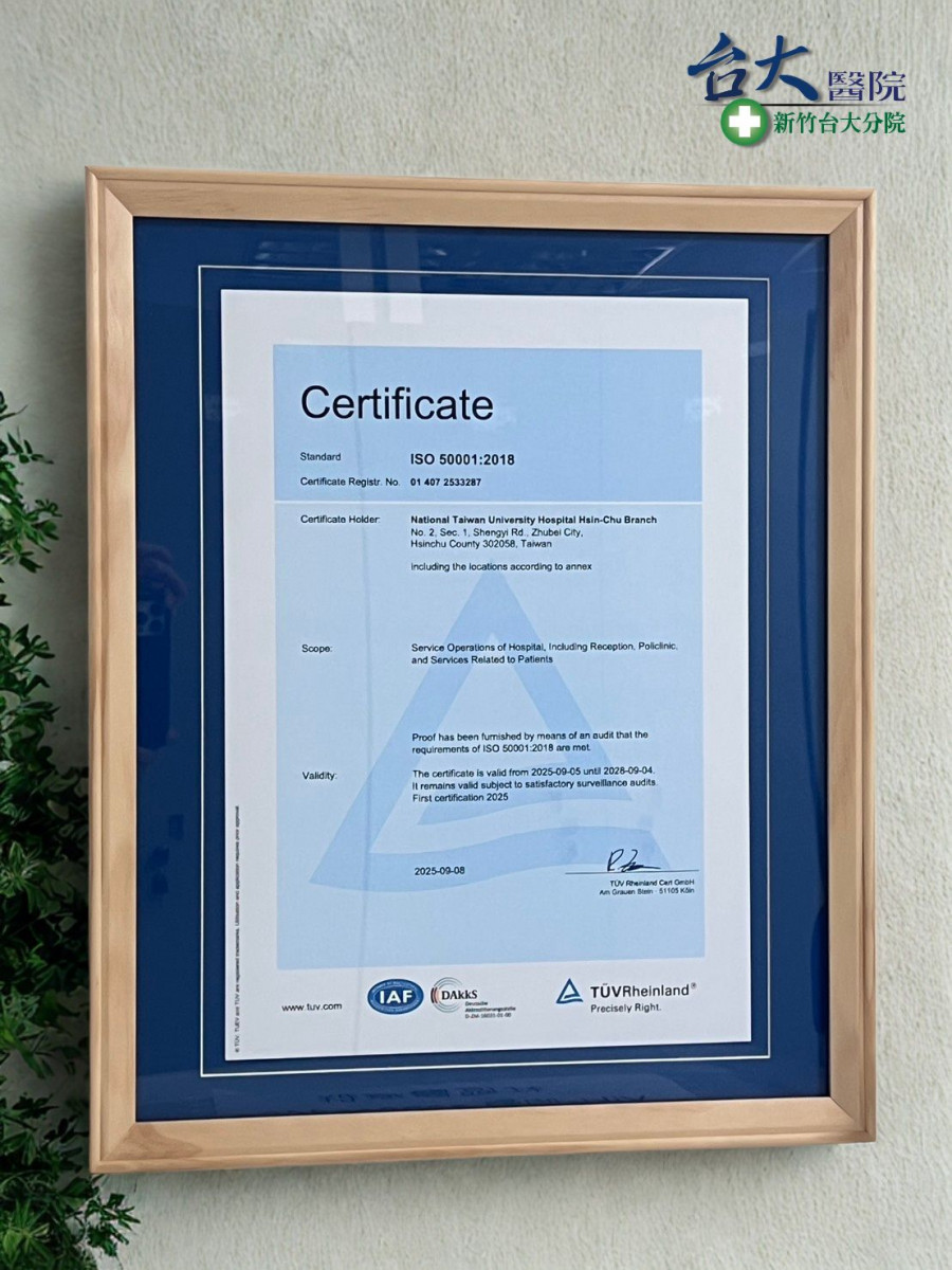 新竹臺大分院完成國際第三方專業驗證審核,正式取得 ISO 50001:2018 能源管理系統認證。