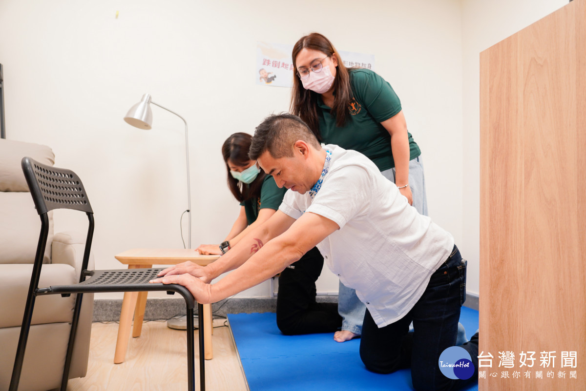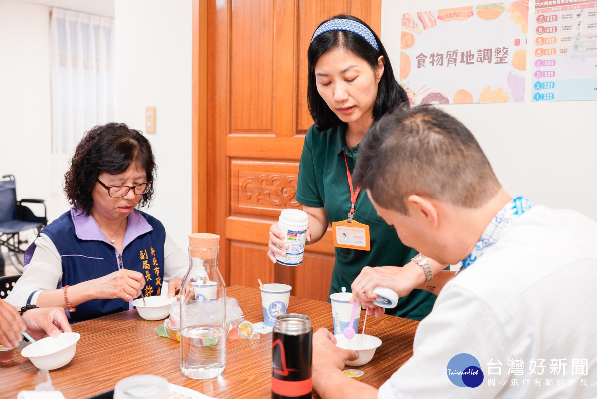 分享會現場安排照顧技巧闖關遊戲,在專業人員指導下,家庭照顧者學習使用增稠劑調整食物的質地,以及跌倒要如何起身,坐輪椅要如何轉移位的技巧。據點還設有舒適的沙發椅空間,能一邊享用花草茶與小茶點,一邊感受精油的芬芳,希望照顧者在照顧家人的同時,也能在據點感受到被關愛疼惜和釋放。