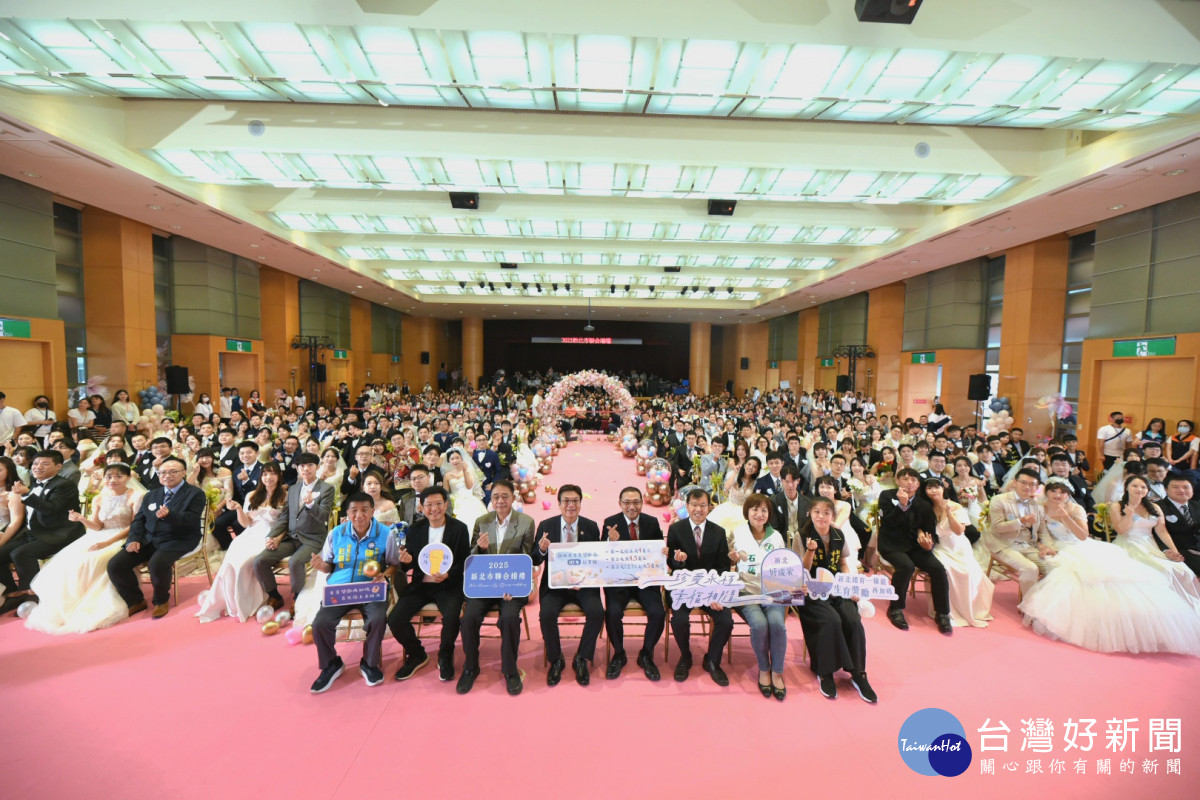 2025新北市聯合婚禮今(19)日於新北市政府浪漫登場,102對新人在市長侯友宜、副市長劉和然的見證下,互許終身、交換誓言,齊聲喊出「我願意!」,現場洋溢著滿滿幸福與祝福,溫馨氣氛瀰漫整個會場。