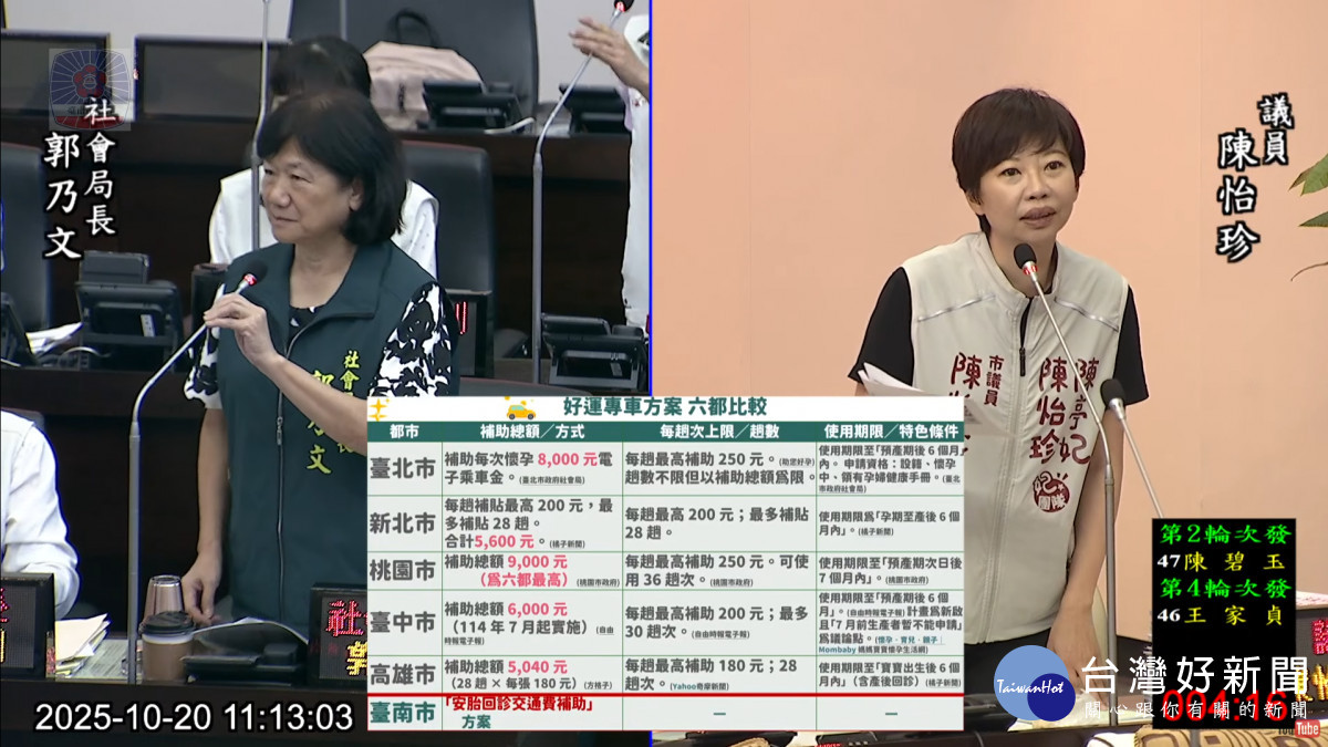 南市議員陳怡珍持續為孕媽咪請命,呼籲市府儘速推動「好孕專車」方案,提供孕產婦便利且安全的交通補助服務。陳怡珍表示,目前全台多個縣市皆已實施孕婦乘車補助政策,包括台北市、新北市、新竹市、嘉義市、高雄市、屏東縣及桃園市等。其中桃園市今年推出的方案補助金額高達全台最高的9,000元,服務對象更擴及從懷孕期至產後7個月;台中市則於7月上路的「好孕專車」方案中,提供最高6,000元的乘車補助,適用期間從產前9個月到產後6個月。