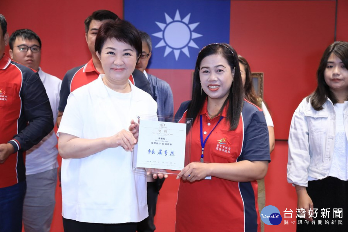 中市清潔隊員謝雅妮拾獲20萬元,拾金不昧,市長盧秀燕頒獎表揚。