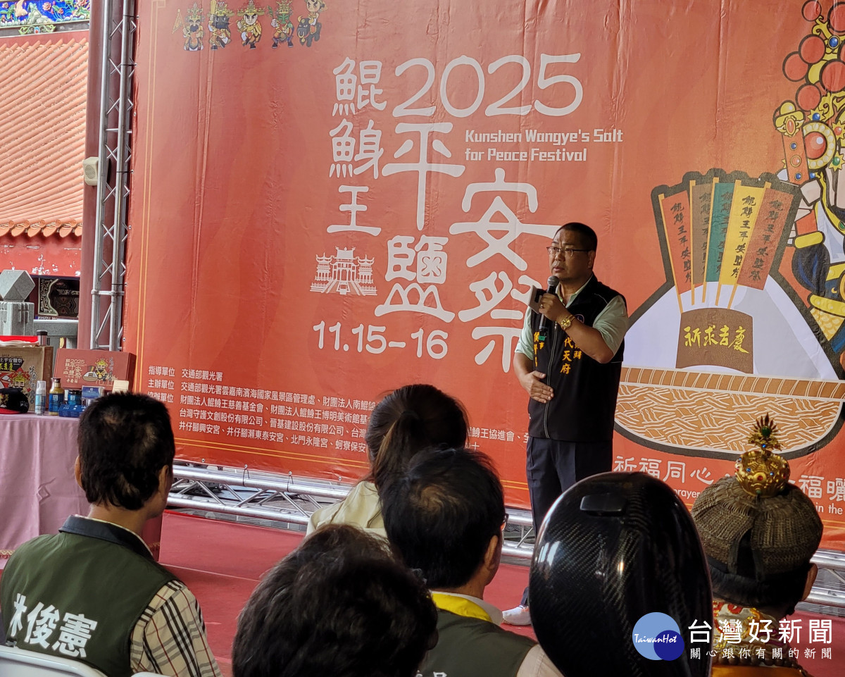 由南鯤鯓代天府、雲嘉南風景區管理處共同舉辦的2025鯤鯓王平安鹽祭,將於11月15、16日在南鯤鯓代天府廣場舉行,為行銷此活動,22日舉辦行前記者會。南鯤鯓代天府總幹事侯賢名表示,鯤鯓王平安鹽祭於22年前開始舉辦,已是全世界知名的宗教盛會,廟方與雲管處分別推出平安鹽袋、搏杯挑戰賽等活動。雲管處長徐振能表示,活動加碼推出2場晚會,期能助災民重新站起來。