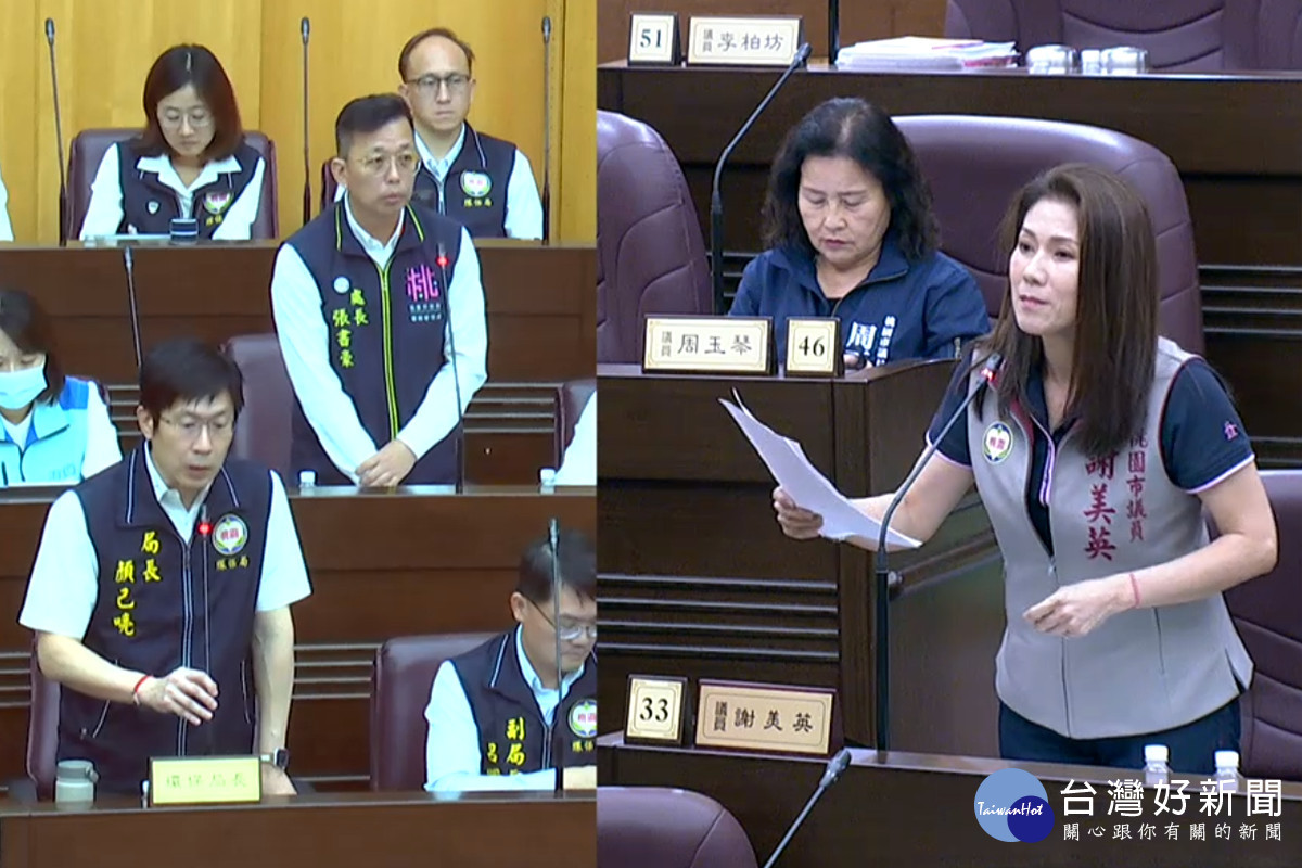 桃園市議員謝美英於議事堂進行質詢。<br />