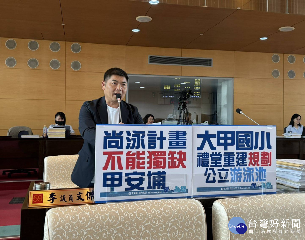 市議員李文傑說,台中市政府明年編列6千多萬元經費推動「尚泳計畫」,強調要整合並擴大游泳設備資源,提升學童的游泳能力。要讓學童學游泳,當然要有游泳池,不過,大甲、大安、外埔地區至今仍然沒有一座公立游泳池。李文傑表示,大甲國小禮堂使用迄今已經45年,建物老舊而且有安全隱憂,他不斷爭取重建,感謝教育局支持將此案列入115年度預算重大計畫,他建議可以利用大甲國小舊禮堂拆除重建,一併規劃興建公立游泳池。
