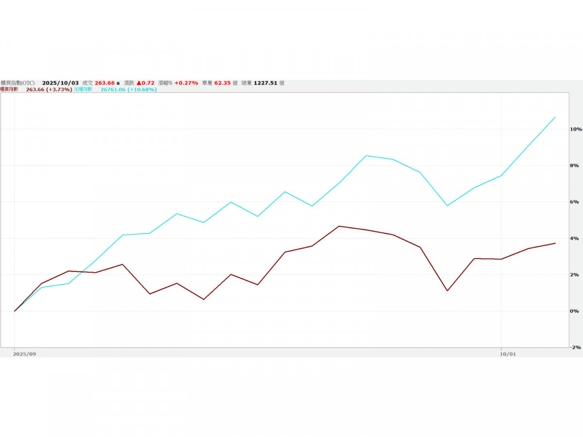 可以觀察的指標是加權指數與櫃買指數的對比。在9月份,淺藍色的加權指數(大型股)比起櫃買指數(中小型股),漲幅更多。當10月加權指數再次創高,櫃買指數並沒有跟上。